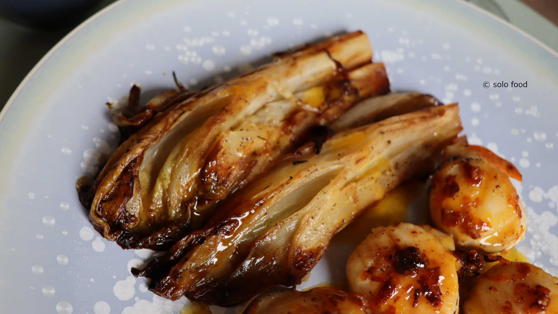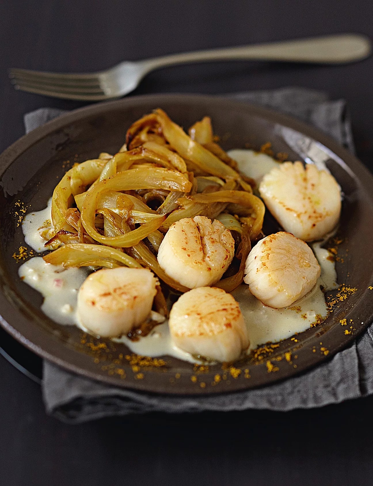 Coquilles Saint-Jacques, compotée d'endives au curry -