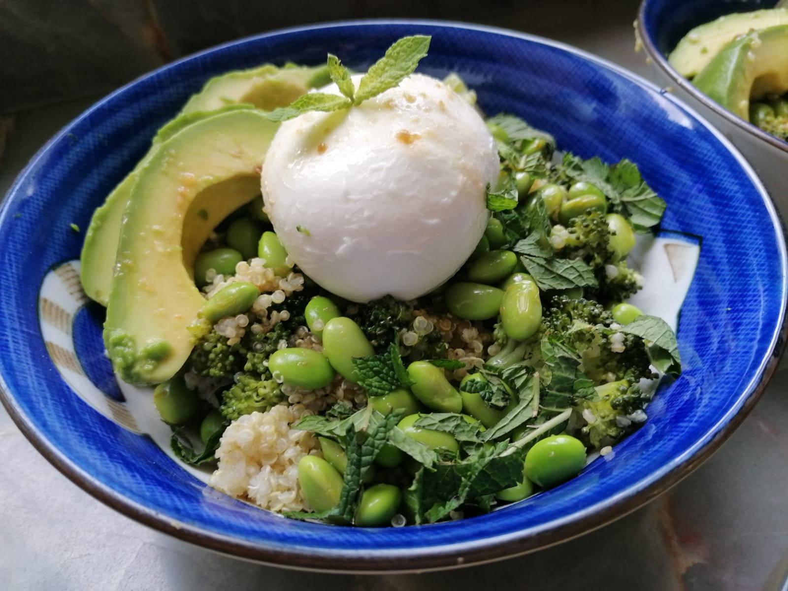 Quinoa verde: brocoli, edamame, avocat, menthe et burrata -